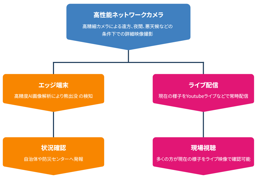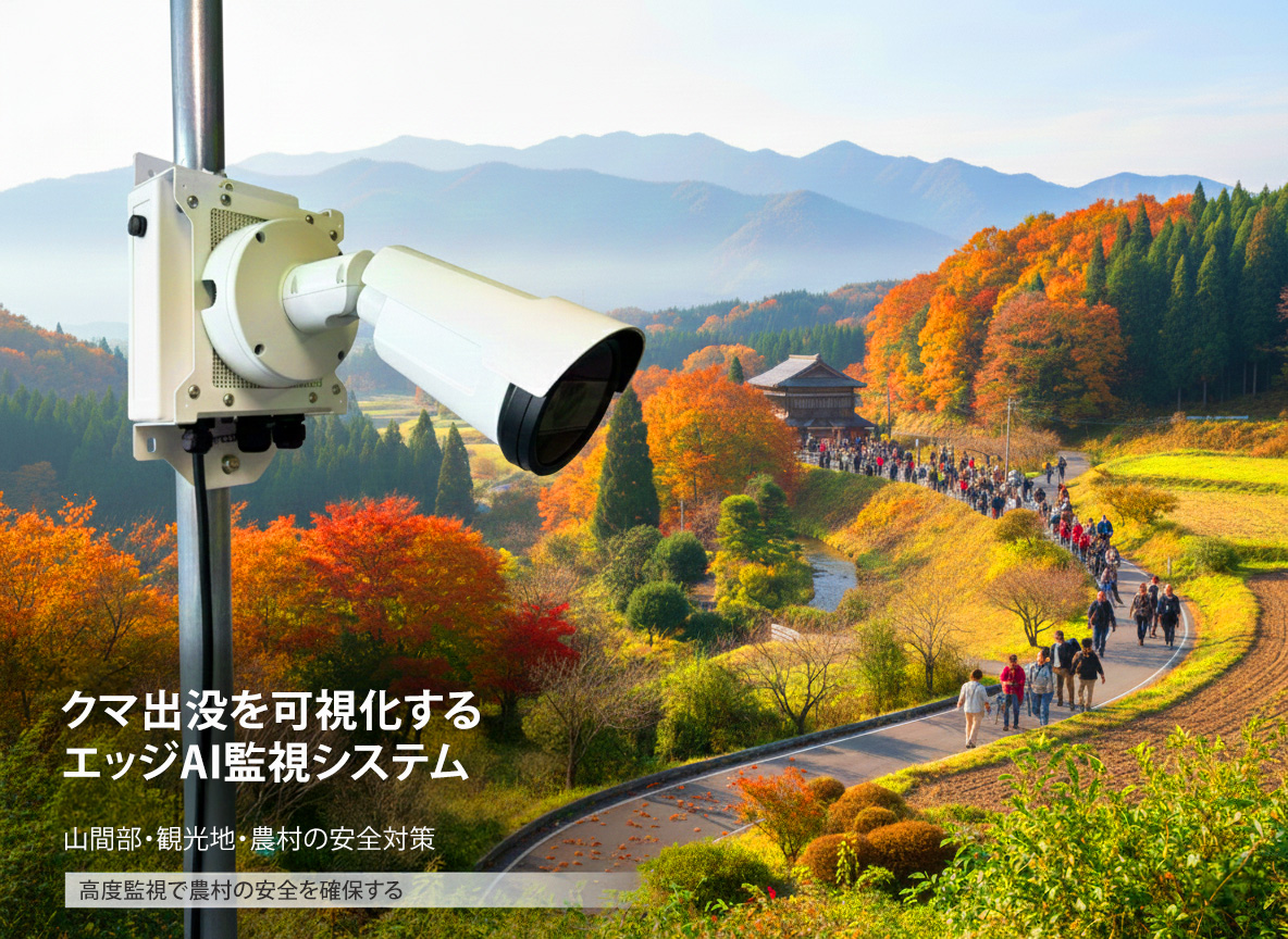 クマ出没の早期発見は、自治体の重要な課題です。本システムでは「出没の瞬間」をカメラ単体で検知・記録・配信し、リアルタイムの危機管理を実現します。